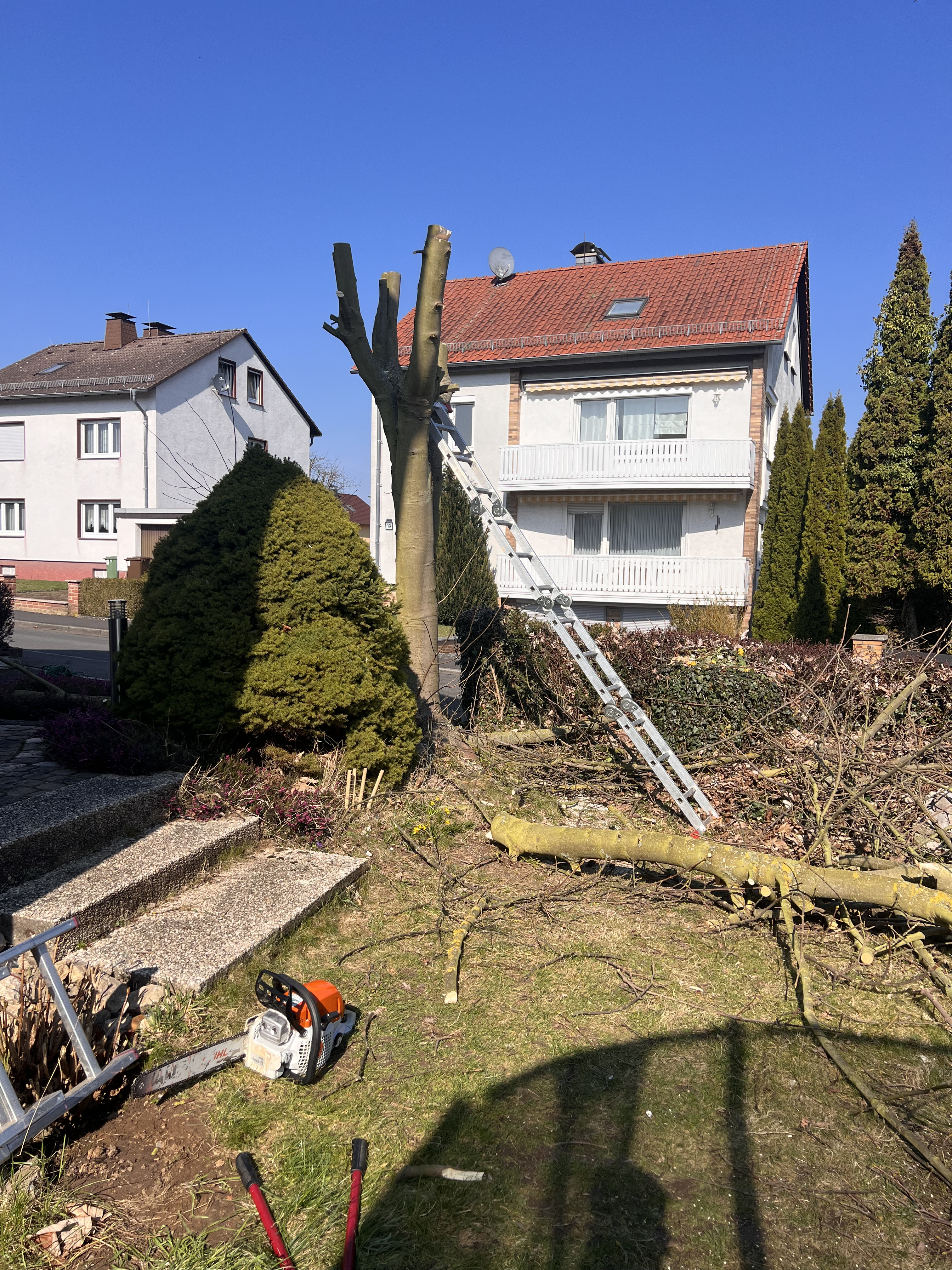 Wir verfügen über den gewerblichen Motorsägenschein (AS Baum I), arbeiten mit professionellem Equipment und bringen praktische Erfahrung aus zahlreichen erfolgreich abgeschlossenen Projekten mit. Bei besonders anspruchsvollen Fällen, z. B. großen Bäumen mit Seilklettertechnik, ziehen wir geprüfte Fachkräfte externer Partnerfirmen hinzu, um höchste Sicherheit und Qualität zu gewährleisten. .